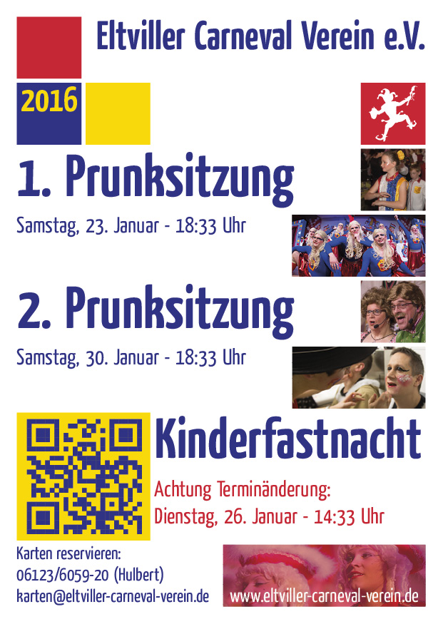Ab sofort können vorreservierte Eintrittskarten für unsere beiden Sitzungen 2016 im Ladengeschäft der Fa. Glasgestaltung Hulbert in der Wörthstr. 29, Eltville abgeholt und bezahlt werden. Wer sich noch nicht vorab Plätze gesichert hat, erhält Karten dort natürlich auch direkt im Vorverkauf für je 13,-€.