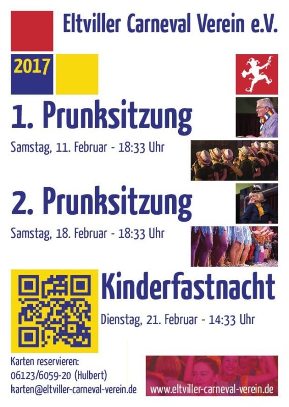 Der Kartenvorverkauf des ECV für die Sitzungen der Kampagne 2017 startet ab sofort in die heiße Phase. Wer Eintrittskarten für die beiden Prunksitzungen des Vereins am 11. und 18. Februar des kommenden Jahres erwerben möchte, kann diese über unsere Internetseite, per Mail unter karten@eltviller-carneval-verein.de oder telefonisch unter 06123/605920 bestellen. Oder aber die Sitzplätze direkt im Ladengeschäft der Glasgestaltung Hulbert in der Wörthstr. 29 in Eltville zu deren Öffnungszeiten (Mo-Fr, 8 bis 12:30 Uhr, Mo und Do, 15 bis 18:30 Uhr) aussuchen und die Karten mitnehmen – hier können auch bereits vorbestellte Karten abgeholt werden. Der Preis je Eintrittskarte für die Sitzungen beträgt 15€.