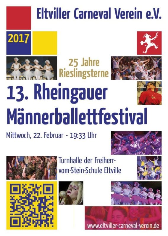 Darüber hinaus freut sich der ECV, neben der eigenen traditionellen Kinderfastnacht am 21. Februar die inzwischen 13. Ausgabe des Rheingauer Männerballettfestivals am 22. Februar 2017 ausrichten zu dürfen. Wir möchten ausdrücklich darauf hinweisen, dass für diese Veranstaltung noch keine Karten erhältlich sind. Der Vorverkauf für das Festival wird im Januar 2017 an einem festen Termin stattfinden, diesen erfahren Sie rechtzeitig über diese Seite oder aus der regionalen Presse.