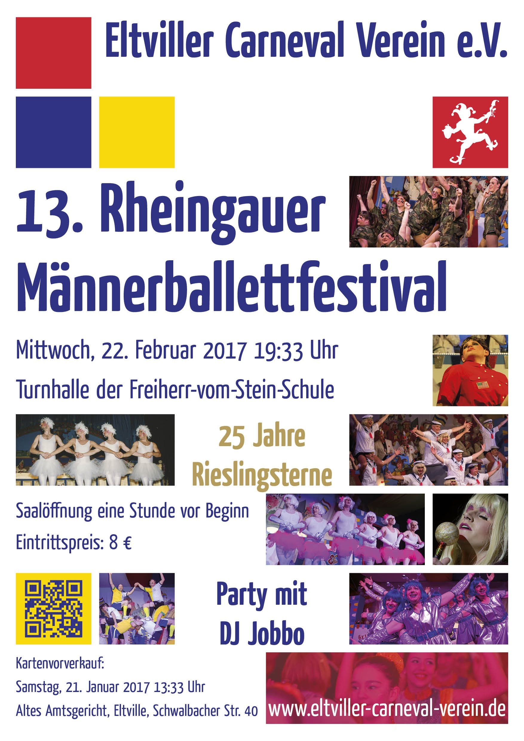 Der Eltviller Carneval Verein freut sich, in dieser Kampagne wieder das Rheingauer Männerballettfestival in der ECV-Narhalla ausrichten zu dürfen, insbesondere da das eigene Männerballett Rieslingsterne 2017 sein 25jähriges Bestehen feiert. Die 13. Auflage der Veranstaltung steigt am Mittwoch, den 22. Februar ab 19:33 Uhr in der Turnhalle der Freiherr-vom-Stein-Schule.